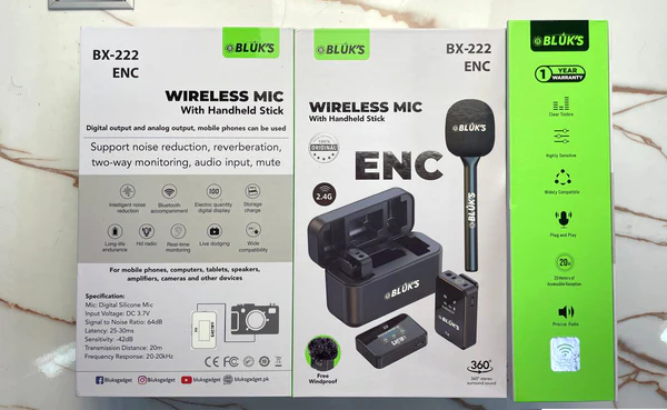 🎙️ Engineered for Performers, Creators & Professionals The BLUK’S BX-222 ENC Wireless Microphone is your all-in-one audio solution designed for crystal-clear voice delivery in any environment. Equipped with ENC (Environmental Noise Cancellation) and a sleek handheld stick, it’s perfect for on-the-go content creation, broadcasting, and professional communication.