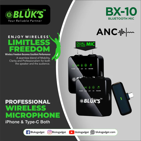 **BLUKS BX-10** is a premium **dual microphone set** with **Active Noise Cancellation (ANC)**, designed for **iPhone and Type-C Android devices**. Whether you’re recording podcasts, making professional videos, doing interviews, or live streaming, the BX-10 ensures **studio-quality sound** with zero background noise