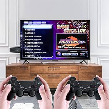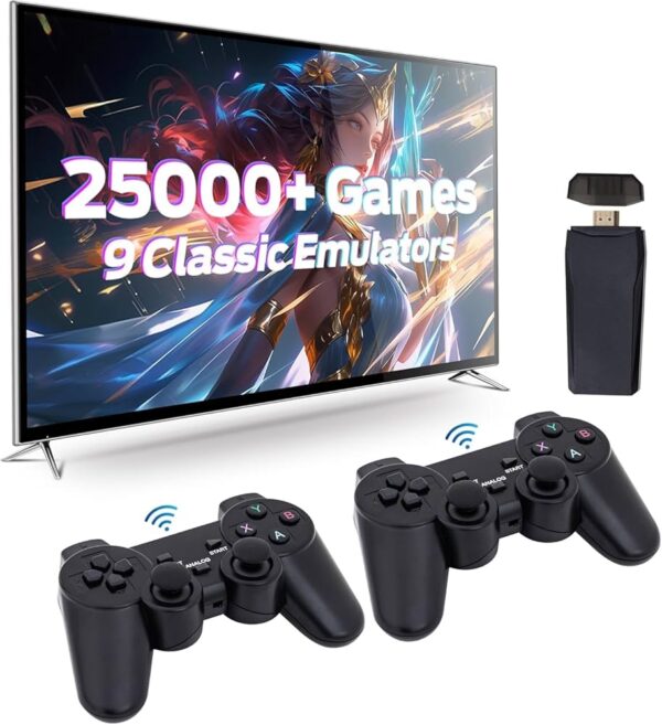 Just plug the console stick into your TV’s HDMI port, power it via USB, connect the controllers, and you’re ready to play!